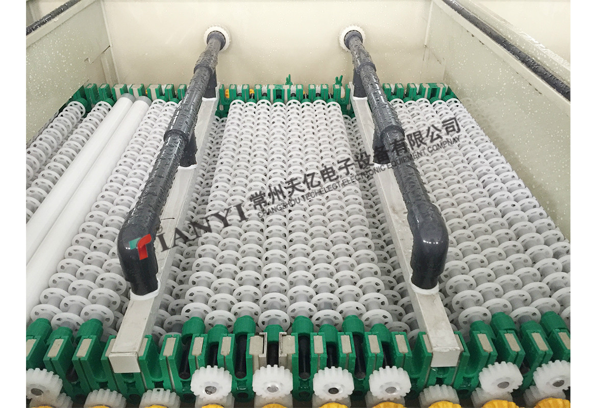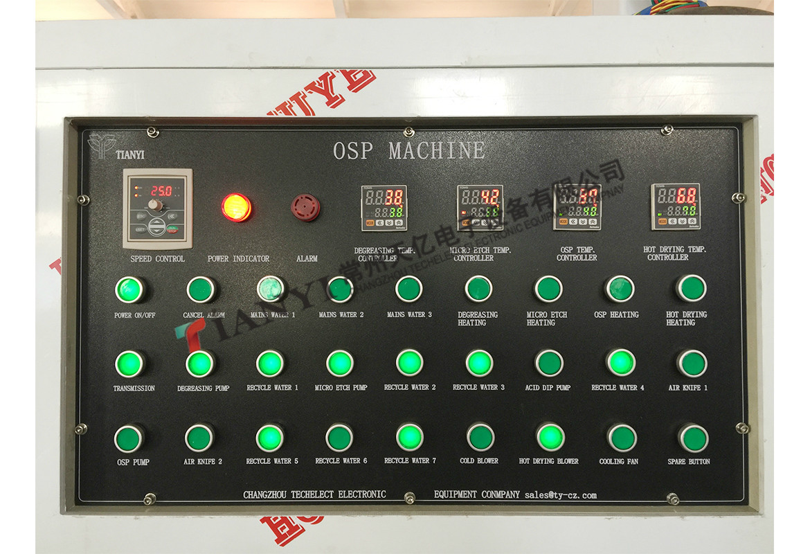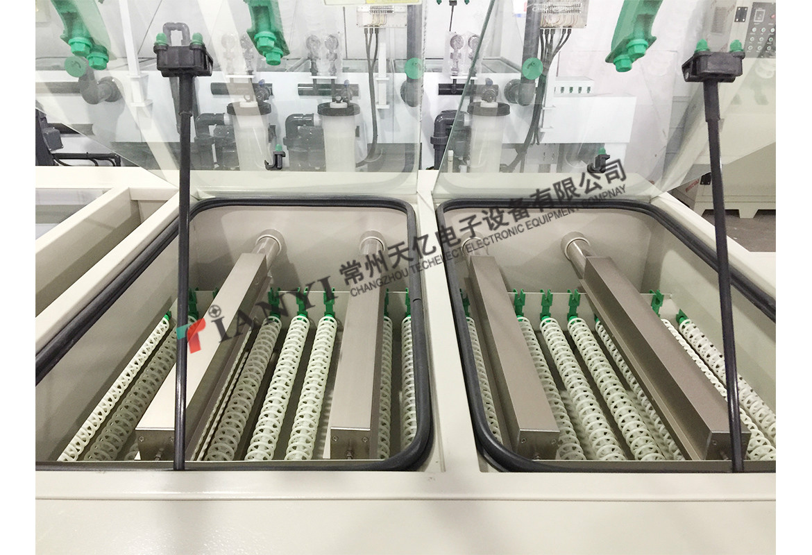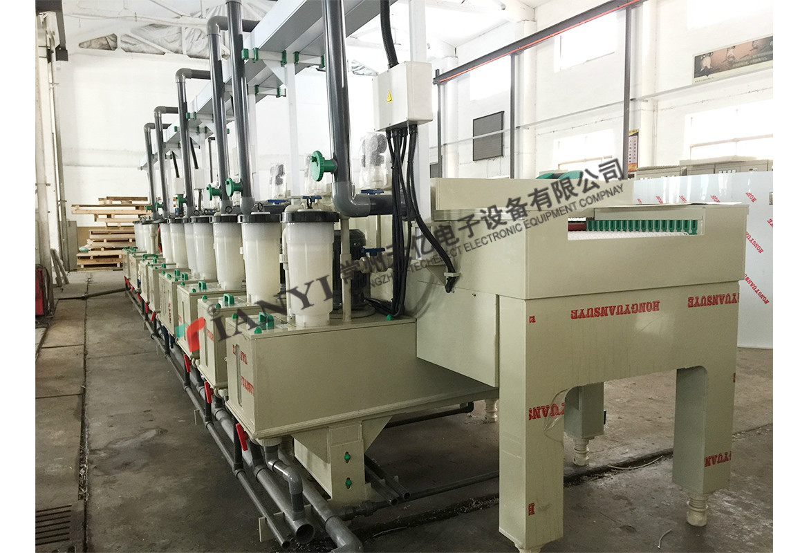該生產(chǎn)線是代替單面板的后處理工藝及雙面板、多層板的熱風(fēng)整平工藝,適用于國(guó)內(nèi)外等多種系列藥水配方,使銅面形成一層均勻堅(jiān)固的有機(jī)保護(hù)膜,使板面具有優(yōu)良的抗氧化 性、可焊性,是新一代的環(huán)保設(shè)備