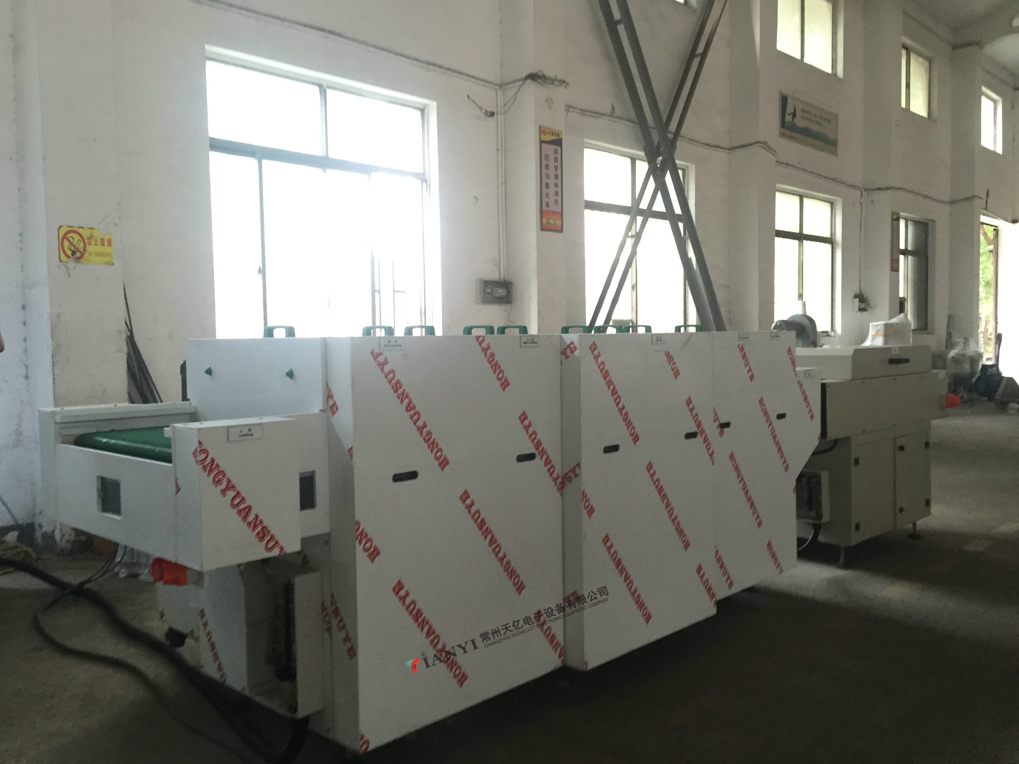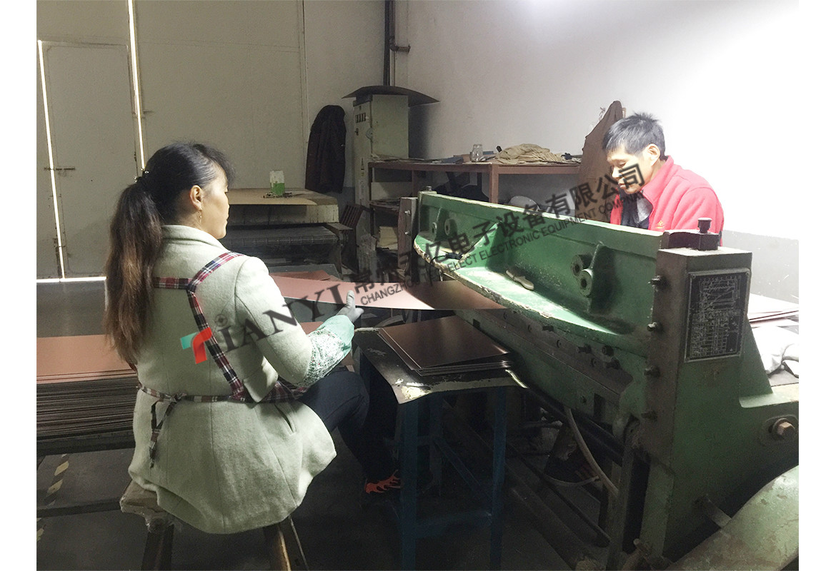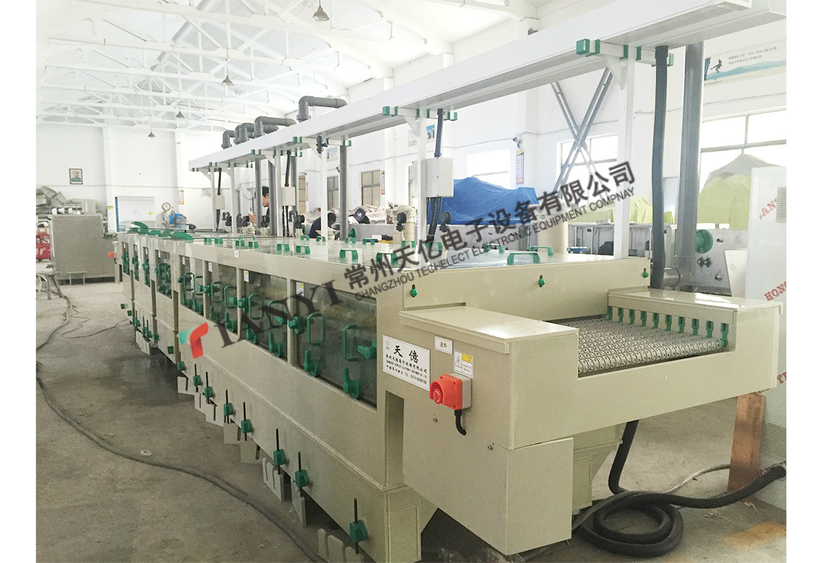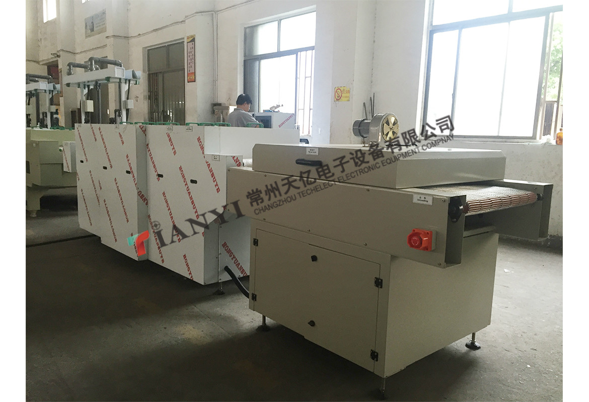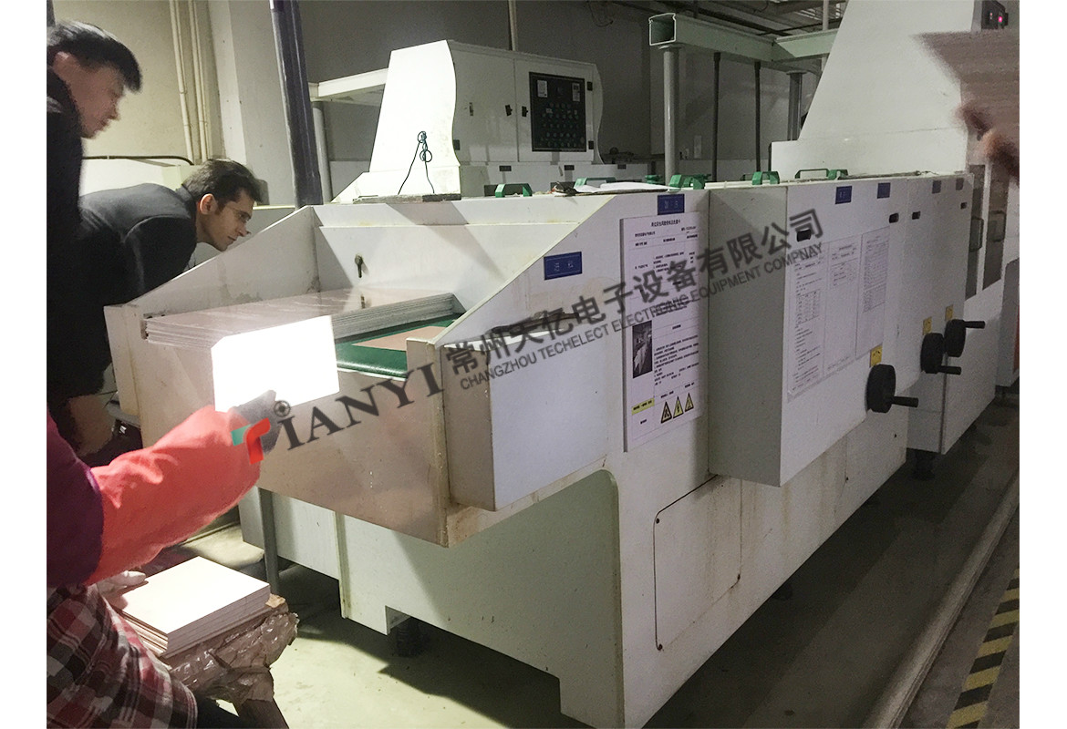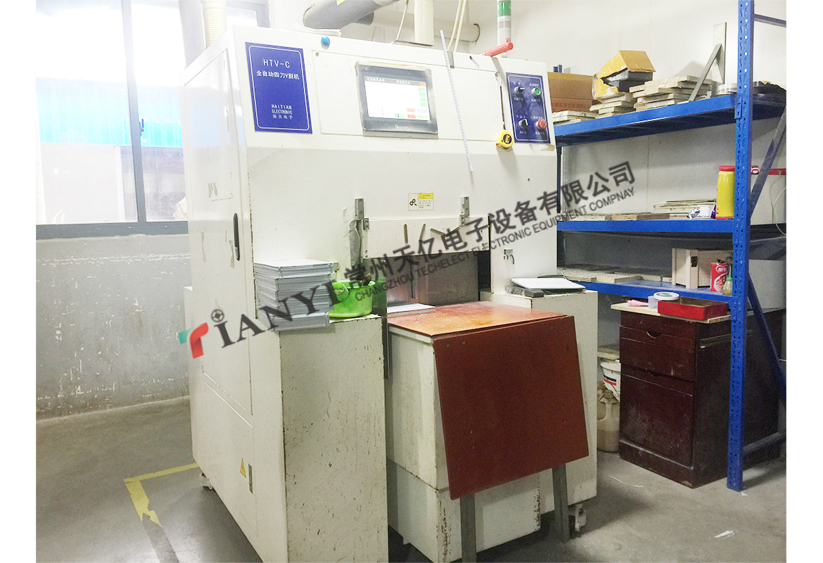 1.剪板→2.前處理磨板機→3.印刷抗蝕油墨→4.烘干(烘箱)→5.蝕刻去膜機→6.打靶→7.CNC鉆孔機→8.中處理磨板機→9.絲印字符→10.UV光固 →11.后處理磨板機→12.絲印阻焊油墨→13.UV光固→14.成型(沖床/V割機)→15.抗氧化→16.檢驗出貨
